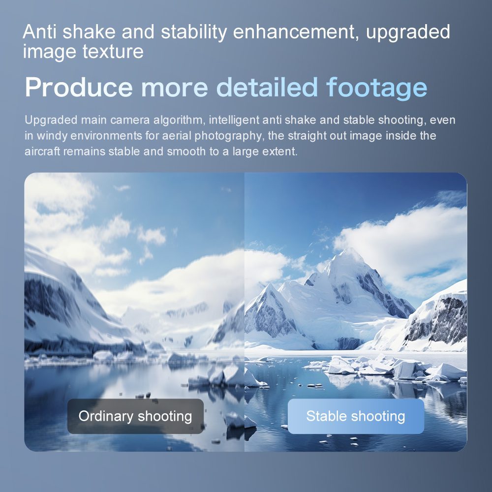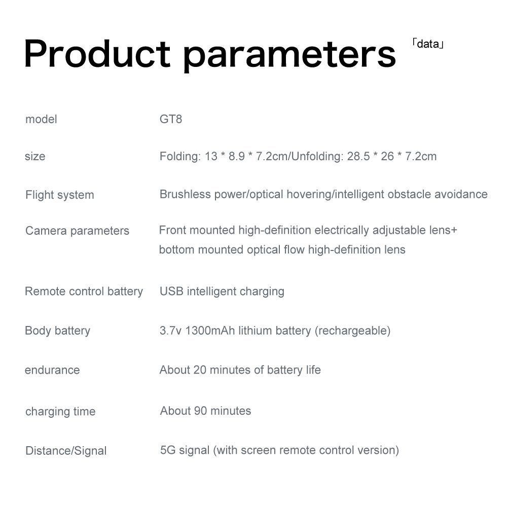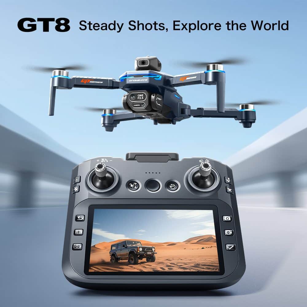Дрон GT8 оснащен 4,3-дюймовым дистанционным экраном, который улучшает пользовательский опыт благодаря усовершенствованной конструкции объектива, обеспечивающей повышенную стабильность и электронную стабилизацию изображения (EIS) для более четкой съемки. Эта модель оснащена режимом удержания высоты и оптическим позиционированием, что обеспечивает стабильные летные характеристики. Кроме того, дрон оснащен удобным ЖК-дисплеем на корпусе и позволяет пользователям настраивать маршруты полета, рисуя желаемые траектории непосредственно в сопутствующем приложении.