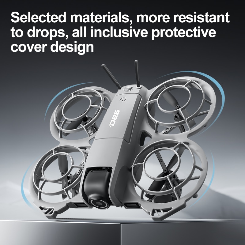 The D26 mini drone features a fully enclosed propeller design for safety, and a compact mini body for easy portability. It supports altitude hold, three‑way obstacle avoidance, and a 180° electronically adjustable camera for upward, level, and low‑angle shots. Optical flow positioning ensures stable flight. Headless mode, one‑key return, and app‑drawn flight paths enable autonomous flying. Equipped with 4K/6K/8K HD camera, WiFi FPV, 2.4GHz anti‑interference, 4‑channel control (ascend/descend/forward/back/left/right/roll), 360° flips, and a 6‑axis gyro for smooth, responsive flight.